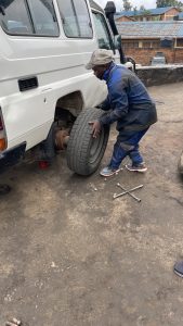 Heute ging’s unter anderem nach Mwezi, das am weitesten südlich gelegene Health Center. Allerdings begann unsere Fahrt gleich mit einer Reifenpanne. Die Security-Leute hatten bei unserem Wegfahren bemerkt, dass im rechten Hinterreifen zu wenig Luft drin war und riefen gleich Jean Paul an. Zum Glück gab es gleich in Tyazo eine Werkstatt, die auch zu so früher Uhrzeit (06:15 Uhr) einen Reifenwechsel durchführen konnte.
