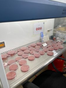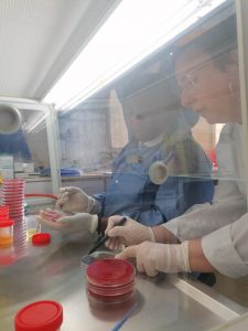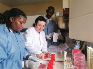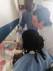 Nach dem Frühstück beginnt für die 3 Homburger Mikrobiologinnen/en wieder ein intensiver Arbeitstag. Dr. Feltes und Dr. Weber können es heute etwas entspannter angehen lassen. Sabryna zeigt den Labormitarbeitern, wie man Agarplatten herstellt.