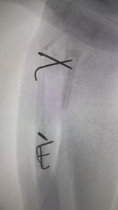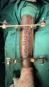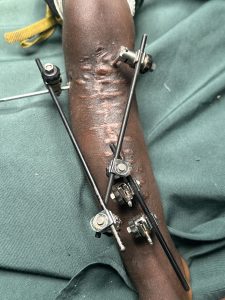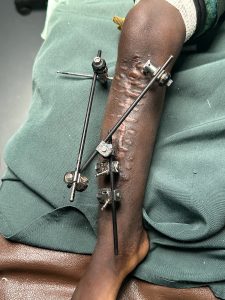 Bei der 3jährigen Chantal (Name geändert) hatten die ruandischen Kollegen einen riesigen Sequester aus der Tibia (Schienbein) entfernt. Nach Abklingen aller Infektzeichen bestand nun die Indikation den entstandenen Defekt mit einem Fibulatransplantat zu überbrücken.