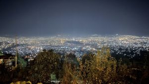 Der weitere Flug war sehr angenehm und problemlos. Pünktlich um 18:50 Uhr landeten wir in Kigali. Hier wurde das Handgepäck nochmals gescannt und wieder fielen die vielen Akkus auf. Hier rettete uns der „Donation Letter“ des Kibogora Hospitals vor weiteren Unannehmlichkeiten. Die kamen dann aber am Zoll, der zu mindestens meinen Koffer inspizieren wollte. Auch hier waren die Erklärungen und der „Donation Letter“ ausreichend um die Zöllner zu überzeugen, dass wir keine Schmugglerware transportierten, und ich durfte nach Inspizierung meines Koffers unbehelligt wieder gehen. Ziemlich müde und geschafft kamen wir so gegen 20:30 Uhr im Hotel „Eagle View Lodge“ an. Toller Blick über das nächtliche Kigali.