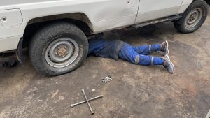 Heute ging’s unter anderem nach Mwezi, das am weitesten südlich gelegene Health Center. Allerdings begann unsere Fahrt gleich mit einer Reifenpanne. Die Security-Leute hatten bei unserem Wegfahren bemerkt, dass im rechten Hinterreifen zu wenig Luft drin war und riefen gleich Jean Paul an. Zum Glück gab es gleich in Tyazo eine Werkstatt, die auch zu so früher Uhrzeit (06:15 Uhr) einen Reifenwechsel durchführen konnte.