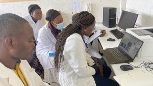 Jetzt mussten wir uns beeilen um rechtzeitig zur Onlineschulung der Labormitarbeiter/innen im Kibogora Hospital zu sein. Als wir im Labor ankamen, saß Solange, die Leiterin, ziemlich verzweifelt vor ihrem Laptop und versuchte vergeblich dem Meeting beizutreten. Nach unserer Hilfe gelang es endlich nach 20 Minuten dem Meeting beizutreten. Die Mitarbeiter/innen der Mikrobiologie der Universität des Saarlandes in Homburg hatten wirklich viel Geduld. Nachdem wir dann noch die instabile WLAN-Verbindung durch eine stabilere LAN-Verbindung ersetzt hatten, konnten die Labormitarbeiter/innen der Schulung ungestört folgen.