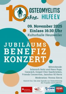 Am Samstag, den 02.11.2019 findet um 19.00 Uhr in der SHG-Klinik in Völklingen ein hochkarätig besetztes Benefizkonzert zu Gunsten des Osteomyelitishilfe Vereins aus Heusweiler mit dem Gitarristen, Singer und Songwriter Michael Marx und dem Jazzchor 92Hertz statt.